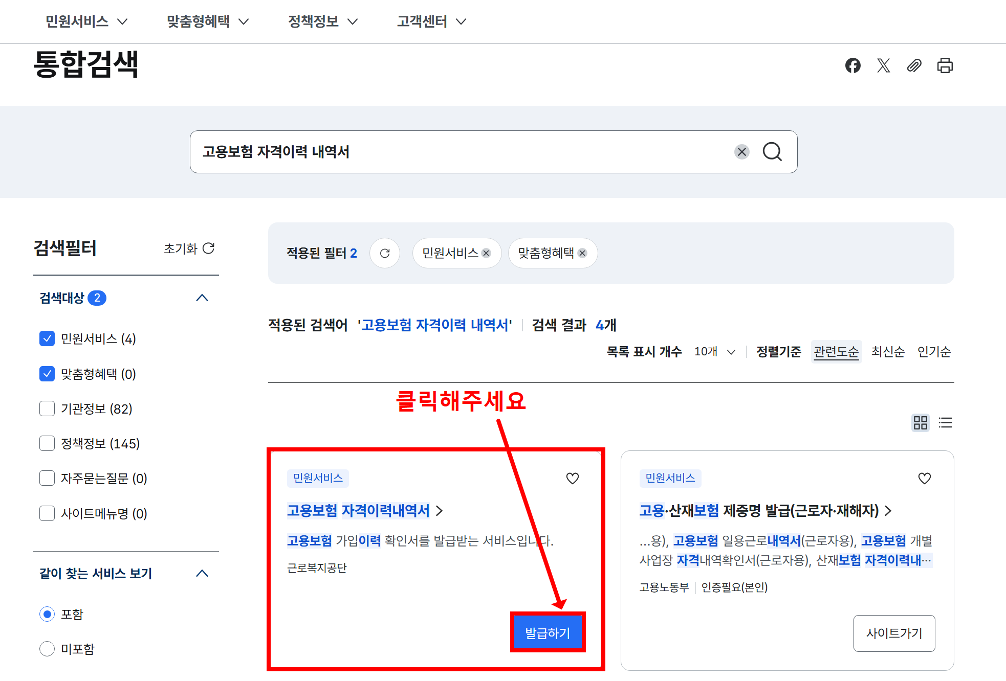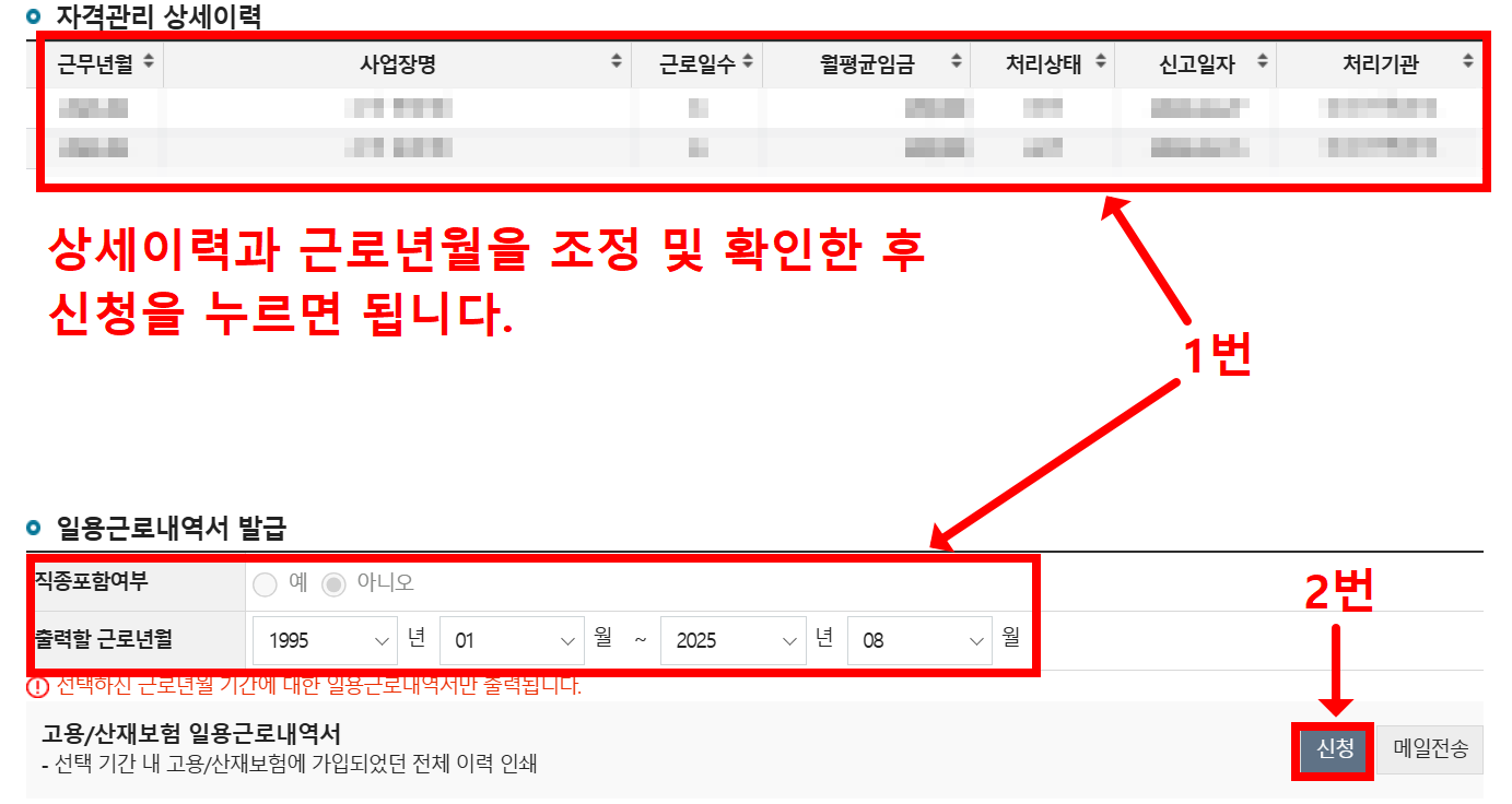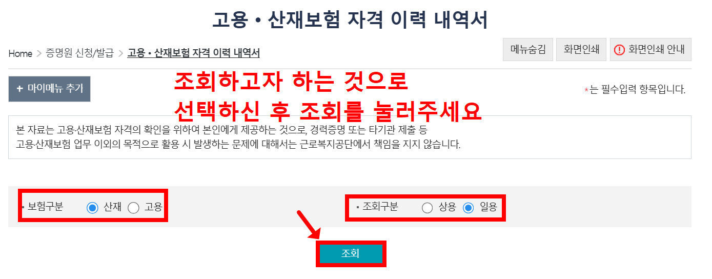 - 메뉴 선택: ‘고용·산재보험 자격이력 내역서’